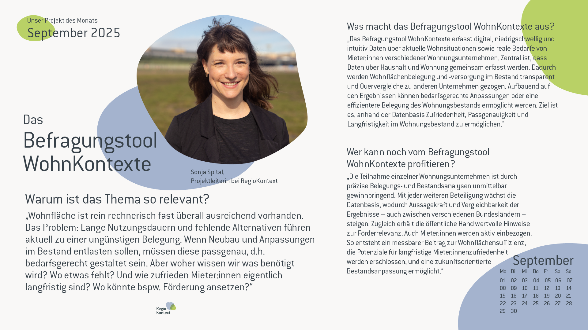 Das Befragungstool WohnKontexte erfasst digital, niedrigschwellig und intuitiv Daten über aktuelle Wohnsituationen sowie reale Bedarfe von Mieter:innen verschiedener Wohnungsunternehmen. Zentral ist, dass Daten über Haushalt und Wohnung gemeinsam erfasst werden. Dadurch werden Wohnflächenbelegung und -versorgung im Bestand transparent und Quervergleiche zu anderen Unternehmen gezogen. Aufbauend auf den Ergebnissen können bedarfsgerechte Anpassungen oder eine effizientere Belegung des Wohnungsbestands ermöglicht werden. Ziel ist es, anhand der Datenbasis Zufriedenheit, Passgenauigkeit und Langfristigkeit im Wohnungsbestand zu ermöglichen.